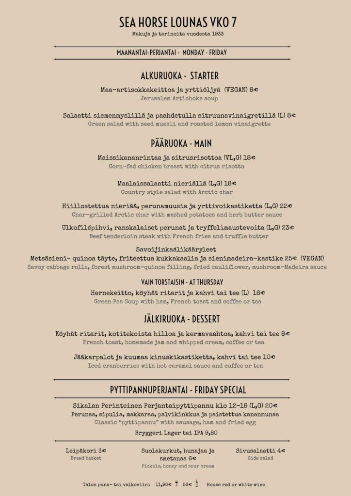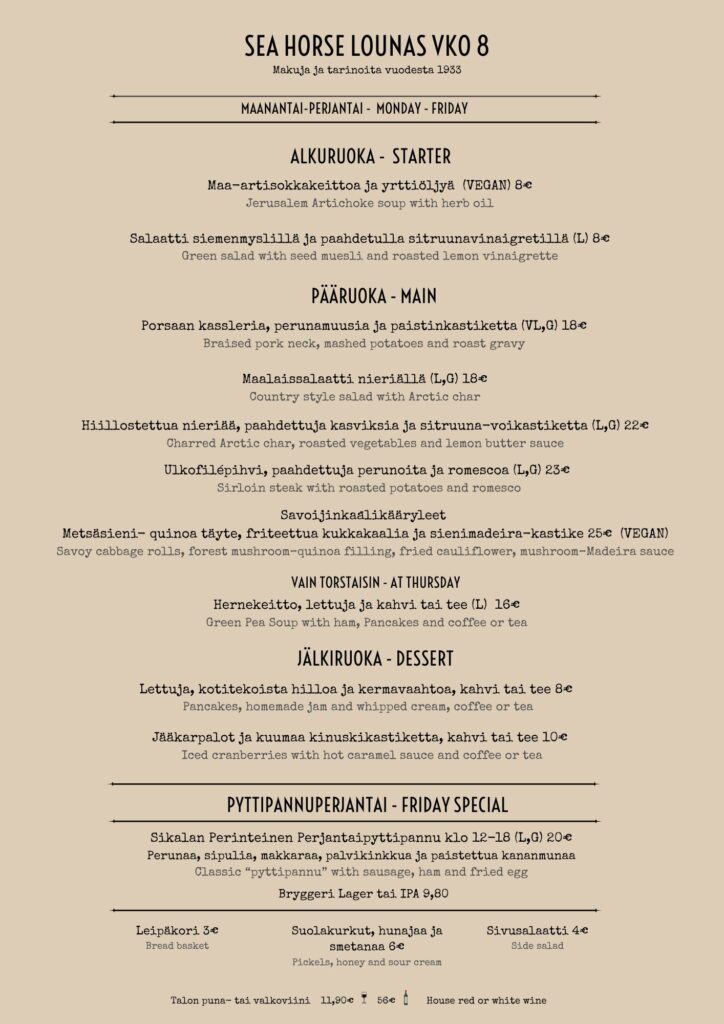 SEA HORSE MENU ja KLASSIKKOMME