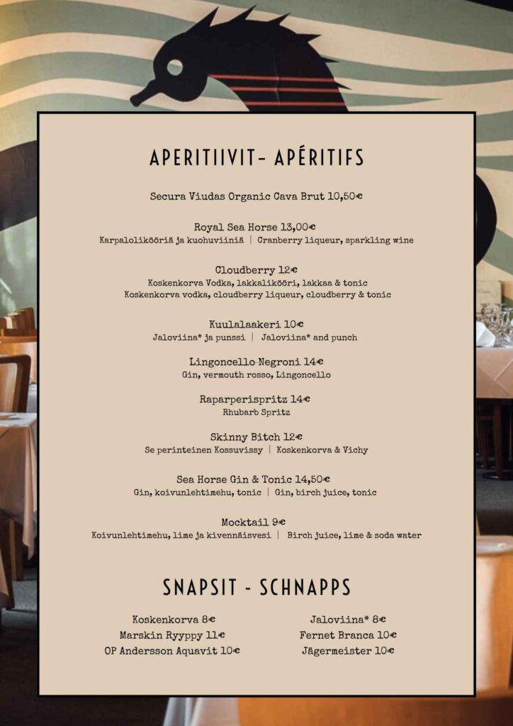 Juomalistalla kuplii, snapsit kilisevät ja kahvi avecineen kruunaa aterian.